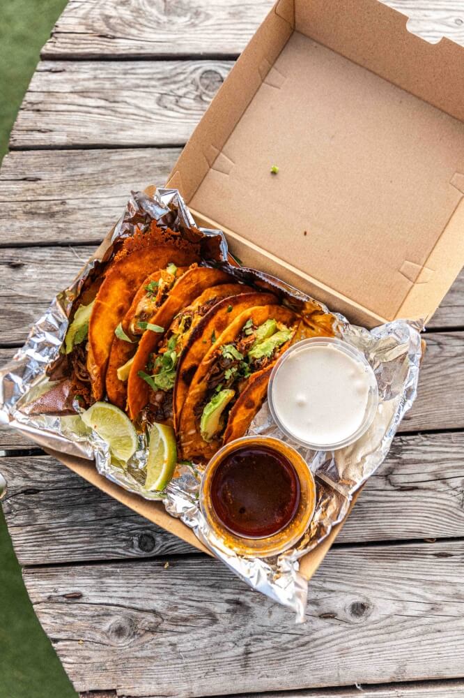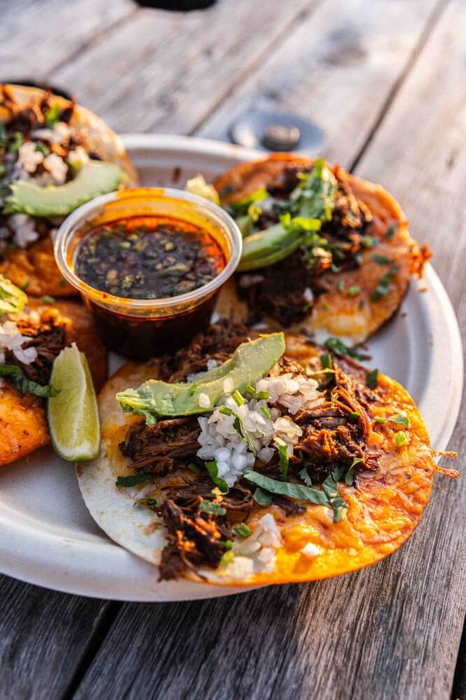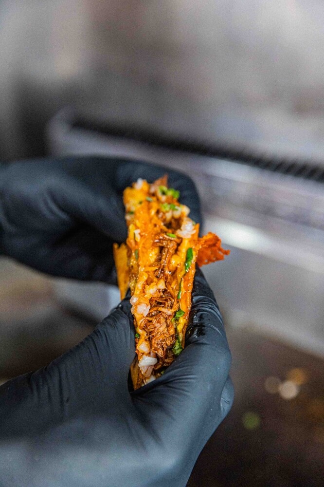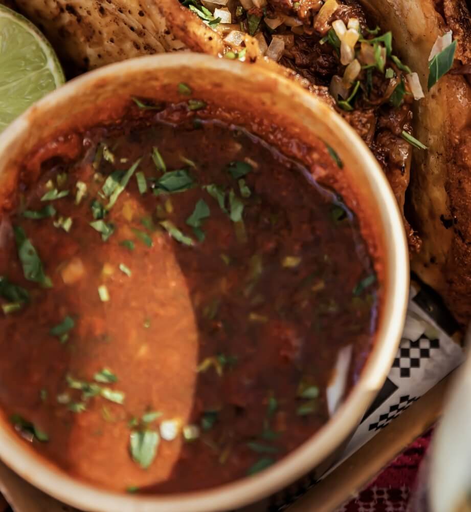 INCLUDES 3 TACOS - SLOW COOKED SPICY BEEF/GRILLED CRISPY TORTILLA/CHEESE/ONION/CORIANDER/CONSUME